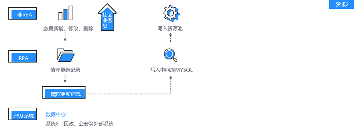 在完成需求 1 的过程中,某些必要的数据字段值在数据中心资源池是缺失的,通过现有的数据同步手段无法更新。需要 RPA 机器人从民政局、公安等自治区业务系统中监测数据更新情况,并爬取数据记录,随后写入到数据中心资源池。