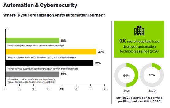 50%受访者表示,2021年已在医院中部署了自动化技术,以提升工作效率和应对新冠疫情;